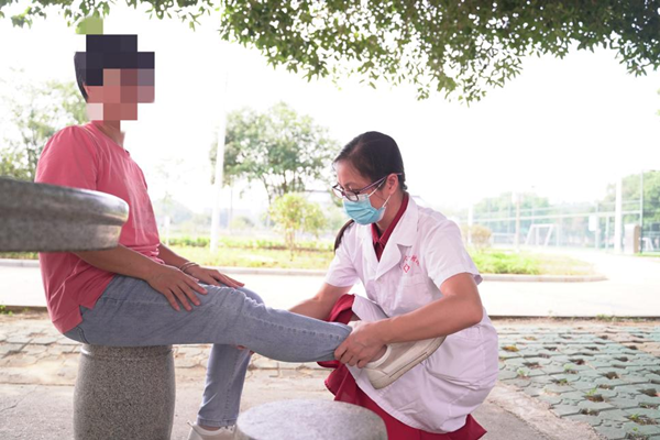 黄晓梦护士长在检查患者的膝关节恢复情况