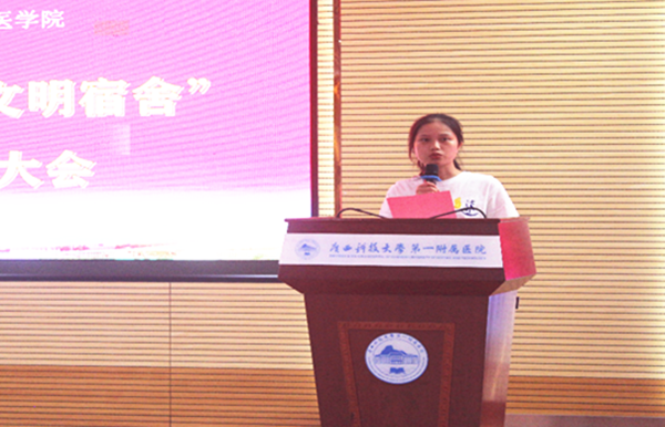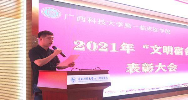 为了培养学生良好的卫生、生活习惯,进一步完善学院宿舍管理制度,强化文明宿舍建设,营造和谐健康的宿舍氛围。广西科技大学第一临床医学院于9月26日在白沙教学点学术报告厅举办了2021年“文明宿舍”表彰大会。第一临床医学院学工办主任、团委书记唐艳红以及学院专职团干、辅导员等参加了本次大会。