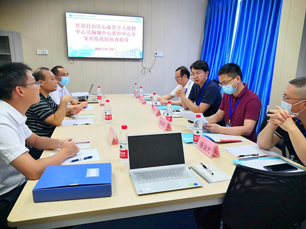 为进一步加强我院心血管介入诊疗技术医疗质量管理,保障医疗安全,加快质控工作的规范化、标准化、制度化建设,提高患者的救治水平,09月25日早上,广西医科大学第一附属医院副院长李浪、广西医科大学第一附属医院黄江南教授、桂林市人民医院心脏中心二病区主任潘迪光、柳州市工人医院心内科一病区主任王红一行人莅临广西科技大学第一附属医院(第一临床医学院),在党委副书记、院长覃天、副院长张施明的陪同下督查我院心血管介入诊疗技术开展情况。