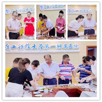 为了给患者营造一个欢乐祥和的节日氛围,让不能回家的患者感受到家的温暖。近日,我科全体医护人员与患者及家属共同手工制作冰皮月饼,喜迎中秋佳节。为了保证活动的顺利开展,科室提前精心准备了冰皮月饼粉、可食用色素、月饼馅、精美的模具等制作冰皮月饼的各种材料,所有医护人员均已提前学习了制作冰皮月饼的操作流程,以便更好的指导患者及家属冰皮月饼的制作方法及技巧。