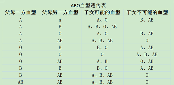 血型是人体血液的一种遗传性状,自发现红细胞ABO血型系统以来,不仅连续发现20多个血型系统,200多个血型抗原;还发现白细胞、血小板均有其各自的血型系统。以及我们的唾液、泪液、胃液中和孕妇的羊水里均存在ABO血型物质。决定ABO血型的基因在人体的第9对染色体上,包括A、B、O三个等位基因。我们每个人遗传的都是两个血型基因,一个是从母亲那儿来的A、B或O基因,另一个是来自父亲的A、B或O基因,这两个血型基因就决定了我们的ABO血型。A和B基因对于O基因来说是显性基因,O基因是隐性基因,即表型为A型的个体基因型可能是AA或AO;表型为B型的个体基因型可能是BB或BO;表型为AB型的个体基因型是AB;表型为O型的个体基因型则是OO。ABO血型遗传详见下表: