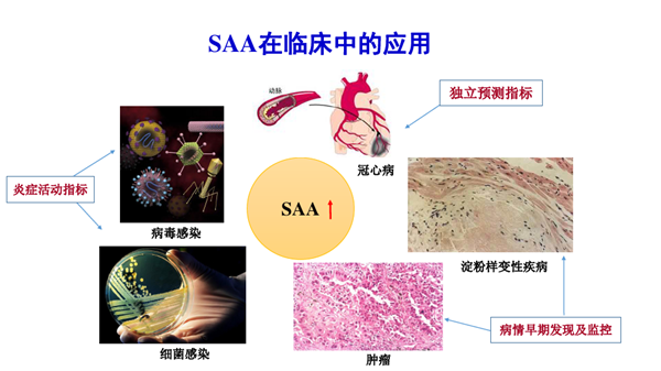 血清淀粉样蛋白A(SAA):血清淀粉样蛋白A是一种非特异性急性时相反应蛋白,其作为炎症标志物的临床价值近年来得到广泛关注。SAA水平变化对于感染性疾病的早期诊断、危险评估、疗效观察及预后评价都具有重要临床价值,除了在细菌感染中升高外,SAA在病毒感染中亦显著升高,根据其升高的程度与其他指标联合应用,可以提示细菌性或病毒性感染,从而弥补了目前常用炎症标志物不能提示病毒感染的不足。