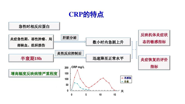 4. 评估疾病活动性和疗效监控:CRP为10-50mg/L表示轻度炎症。CRP升至100mg/L表示较严重的疾病,它的严重程度在必要时需静脉注射。CRP>100mg/L表示严重的疾病过程并常表示细菌感染的存在。