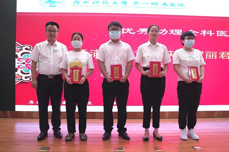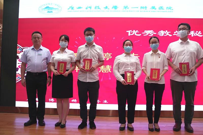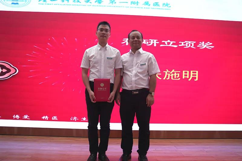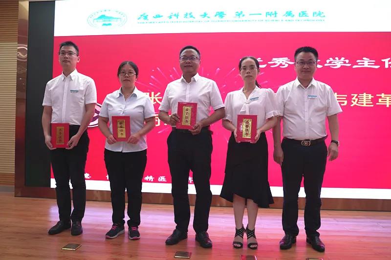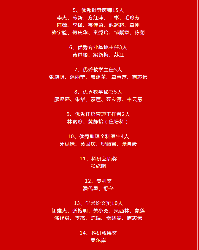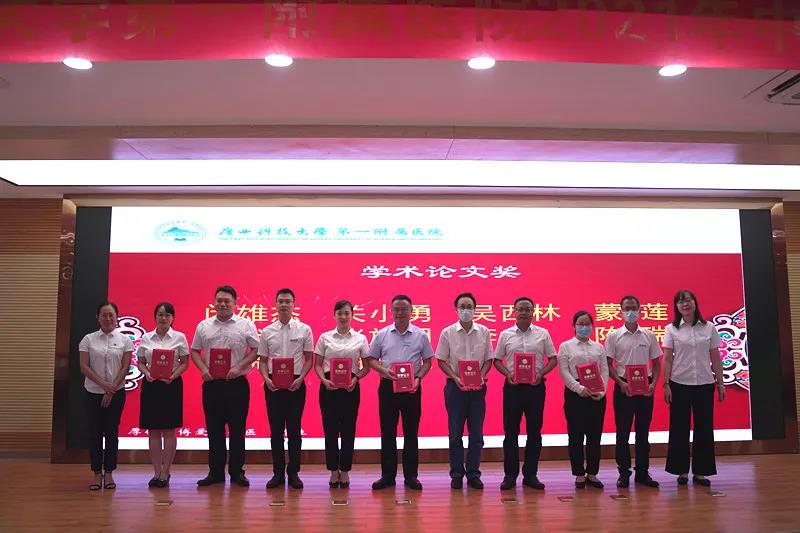 会上,医院分别颁发“医患沟通技能比赛”、“病历质量评比活动”、“医生荣誉奖”、“学术荣誉奖”、“优秀指导医师”、“优秀专业基地主任”、“优秀教学主任”、“优秀教学秘书”、“优秀住培管理工作者”、“优秀助理全科医生”“科研立项奖”等十五个奖项。此次庆典还表彰了覃俊安、宋建平、覃克达、蒋材俊四人从医30年医务工作者“医者成就奖”,由院领导分别为上述获奖科室、人员颁奖