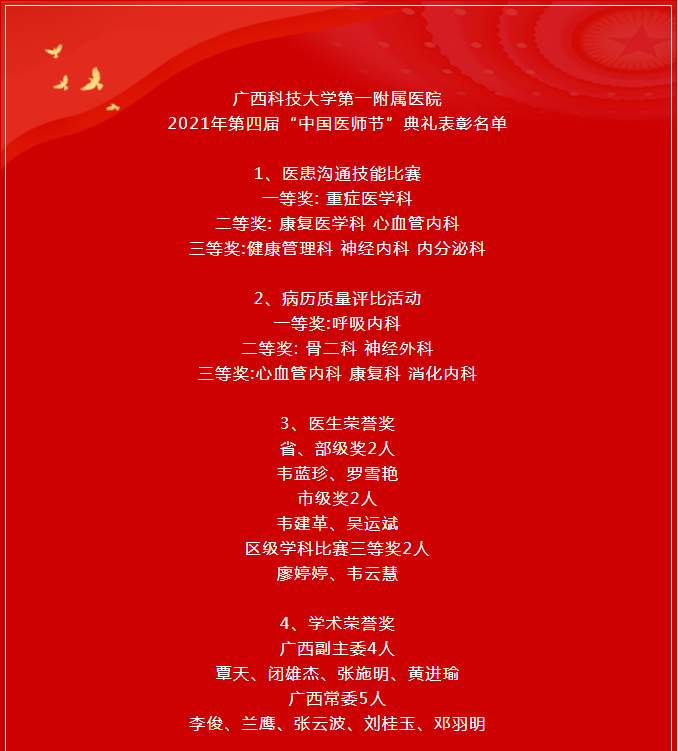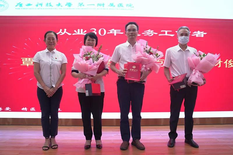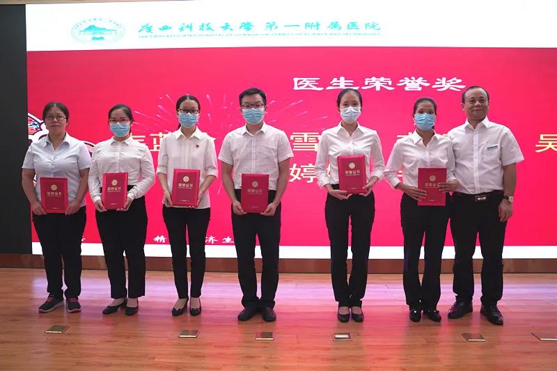 8月18日下午,在第四个中国医师节来临之际,广西科技大学第一附属医院(第一临床医学院)在学术报告厅隆重举行2021年第四届“中国医师节”庆典。庆典表彰了从医30年医务工作者及一批在科研、学术、教学及住培管理方面取得佳绩的医师代表。