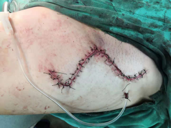 经心胸乳腺血管外科、胃肠外科、骨二科多科联合紧急会诊后排除心肺腹部外伤引起,一致认为左大腿根部前侧刀伤是致命伤,伤者是被刺破大血管致出血休克。危急情况下,急诊科止血、抗休克同时,将患者通过绿色通道直接送到手术室行左大腿根部伤口血管、神经探查吻合术,并由骨二科承担该手术任务。