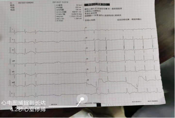 81岁的农阿婆于5月21日早上9点散步至跃进路二安19路公交车站时突发胸闷、头晕,随即晕厥倒地,现场热心群众立即上前搀扶老人并拨打120,还好约2分钟后恢复意识。广西科技大学第一附属医院急诊科接到120指令后立即出车,接触患者后立即监护、吸氧,急查心电图立马发现端倪——心电图提示高度房室传导阻滞,刚好捕捉到患者的心脏至少4秒无法产生正常有效的心室搏动,进而导致大脑供血急剧减少,怪不得阿婆突然晕厥!