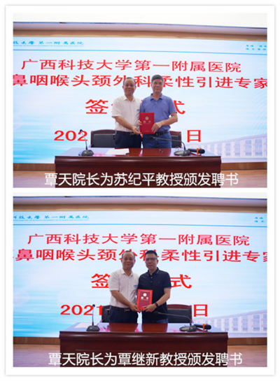 会议举行了隆重的签约仪式,广西医科大学第一附属医院耳鼻咽喉头颈外科苏纪平教授,右江民族医学院附属医院耳鼻咽喉头颈外科覃继新教授受邀为我院耳鼻咽喉头颈外科柔性引进专家,覃天院长为两位教授颁发了签约聘书。