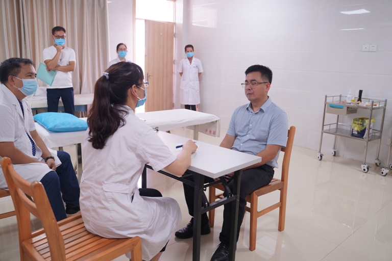 随后,调研专家组对住培基地的临技中心进行了现场走访,谢湘涛还与在培的住院医师代表进行了交流,了解了他们的生活和工作情况。同时,专家组成员还分成6个小组,分别对基层实践基地进行走访、抽查学员病历书写、临床技能带教及考核、全科教学查房及内科教学查房等。