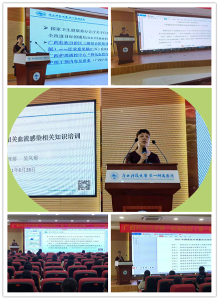 为深入贯彻落实国家卫生健康委《医疗质量管理办法》及《关于印发2021年国家医疗质量安全改进目标的通知》(国卫办医函﹝2021﹞ 76号)等文件精神,进一步加强护理质量安全管理,提升护理质量品质,广西科技大学第一附属医院(第一临床医学院)护理部6月28日18:30在学术报告厅举行了 “降低血管内导管相关血流感染发生率”改进目标专项培训。全院护士长、质控小组、静脉治疗护理小组成员以及全院护理人员300余人参加培训。