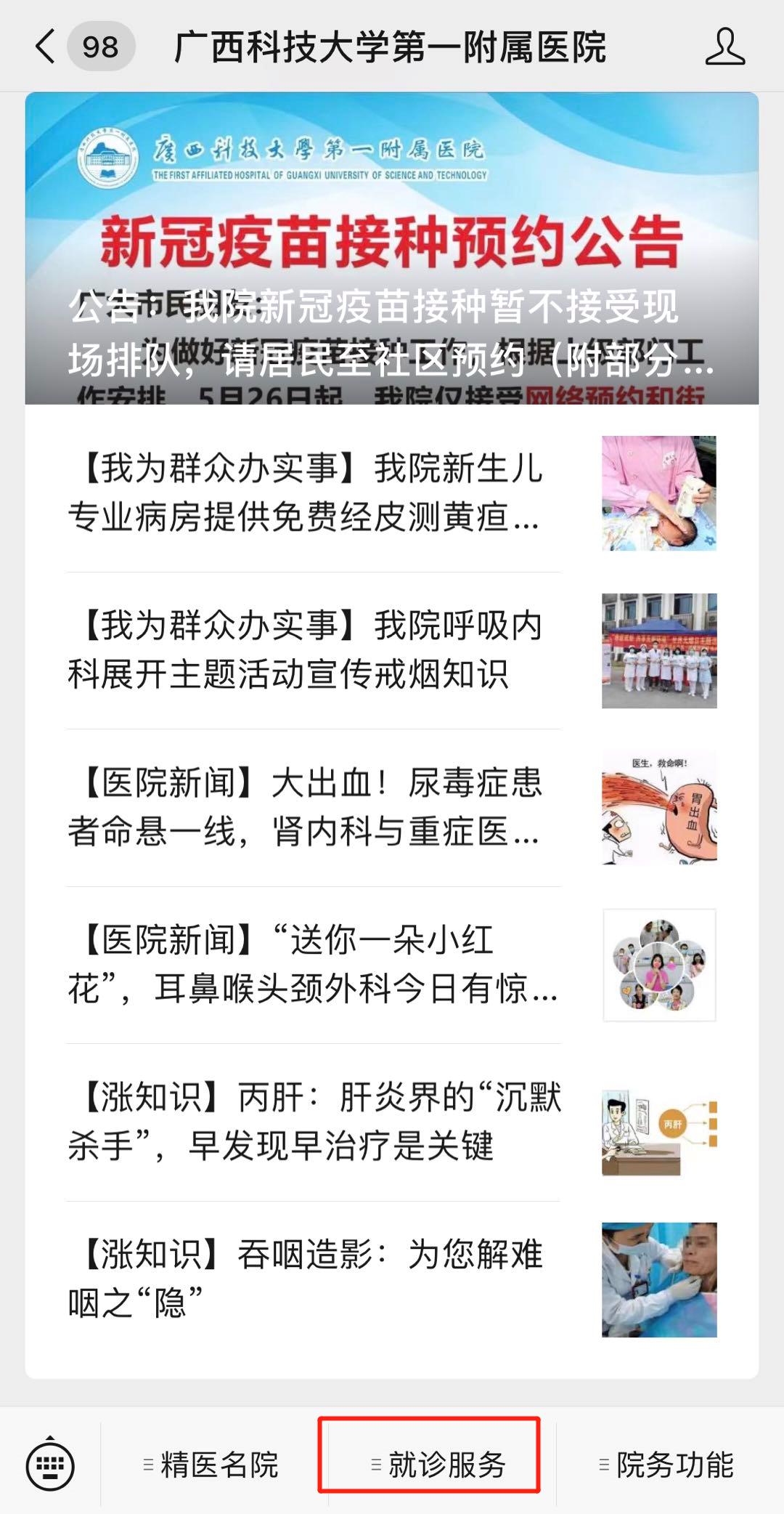 第二步:点击公众号下方“就诊服务”栏目;