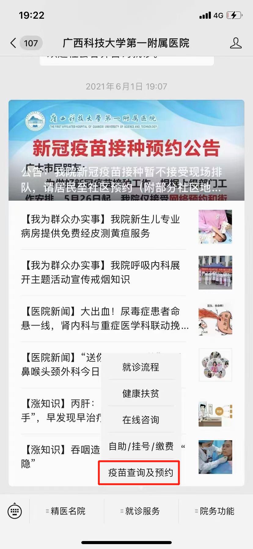 你是不是还在为“今日是否有苗?”这个问题而苦恼?你是否还在为匆忙赶到医院后发现“今日无苗”而赶到沮丧?为了更好地推进新冠疫苗接种工作,服务广大群众,广西科技大学第一附属医院“想群众所想、急群众所急”,医院公众号即日起开通疫苗查询功能,只要关注微信公众号,就可以查到两日内疫苗状况,尽量避免群众“跑空”而耽误时间。