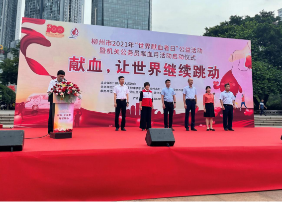 2021年6月14日是第18个世界献血者日,秉承着“献血,让世界继续跳动”的主题,也为了更好地宣传无偿献血活动,6月11日上午8时30分,2021年世界献血者日公益活动暨柳州市机关公务员无偿献血月活动启动仪式在柳州市人民广场举行。广西科技大学第一附属医院(第一临床医学院)派出由医务人员及行政后勤人员组成的志愿者队伍参与了此次活动,用实际行动表示支持无偿献血、为社会贡献正能量的决心。