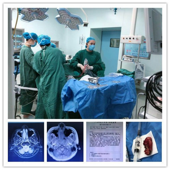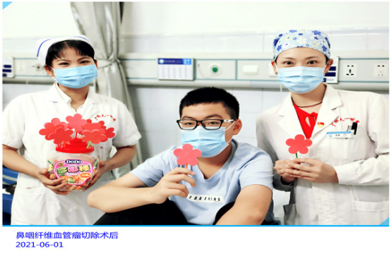 陈瑞主任来到+21床,这个12岁的男孩子因为右侧鼻塞2个月,鼻出血1周入院,鼻咽磁共振可见鼻咽鼻腔60mm×30mm×21mm肿物,考虑右侧鼻咽纤维血管瘤,在完善相关检查后予2021年5月28日全麻下行经鼻内镜鼻腔鼻咽肿瘤切除术。鼻咽血管瘤是鼻科医生不敢小觑的手术之一,靠近颅底、鼻腔鼻咽血管及视神经,稍不注意就会引起大出血危及生命。通过术前完备的检查,在备好血的前提下,陈主任用精湛的鼻内镜等离子微创手术完整切除整个肿物,术中出血约40ml,术后患儿恢复良好,患儿家属对陈瑞主任精湛的技术表示衷心的感谢。