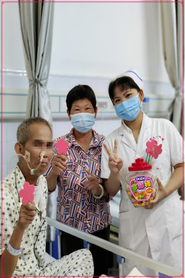 18床何阿公做了全喉切除术,收到小红花棒棒糖时,何阿公露出了久违的笑容,他的老伴说到:“我和老头子是第一次收到棒棒糖,还是小红花棒棒糖,太开心了,今天我俩也做了一回孩子!刚来你们科室的时候,一进门就看到“送你一朵小红花”几个字,我们还以为来到了儿科,现在我们知道了,这是你们的科室文化,我们感受到了,谢谢你们。我们会继续努力,战胜疾病,争取早日康复!”