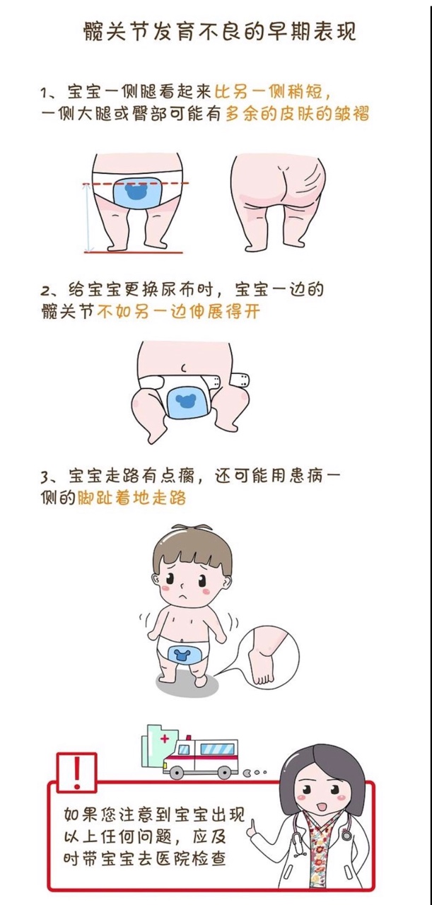 宝宝出现双下肢皮纹不对称,包括腹股沟和臀部下方皮肤皱褶的深度、长度、数量不对称或婴幼儿屈髋屈膝时,其双膝高度不相等;髋关节外展时有弹响或者髋关节外展受限或不对称都会被诊断为髋关节发育不良。