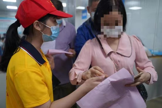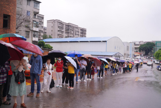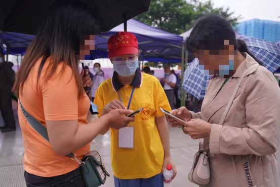 5月30日上午,大雨倾盆,医院疫苗接种点预计在上午8时准时开门为居民接种疫苗。但是,还没有开门就已经有很多居民前来在雨中等候,现场由学生志愿者和辖区街道工作人员组成的引导小组,不停地穿梭于人群中间,为居民讲解疫苗预约、登记的情况,及时将疫苗接种的最新动态传递给前来咨询的居民。