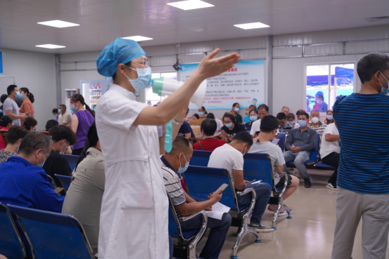 在留观室内,由于当天接种的人数较多,尽管留观室安置了很多座位,但还是被坐满了。一旦有观察结束的居民离开,现场值班的医务人员就拿着扩音喇叭,引导人们到有空位的地方就坐,在没有位置的时候,引导等待居民至留观室角落处等候,不占据主要通道。