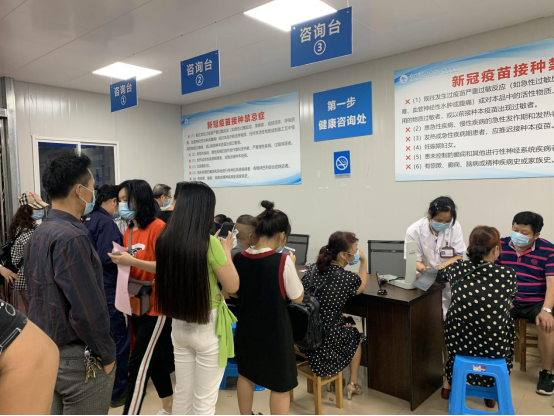 为更好的服务居民,医院领导班子通过紧急磋商,决定延长接种时间至晚上9时。时间紧、任务重,38位来自医院临床、行政、后勤各科室的医务工作者第一时间集结,他们分赴至疫苗接种点各自岗位,紧张而有序地为居民进行引导、登记、咨询、接种、接种后观察等各项服务。
