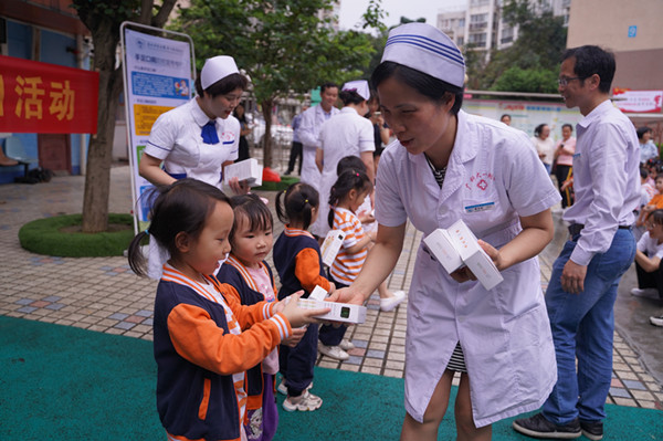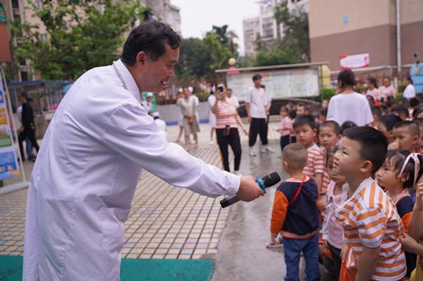 儿科主任石家雄向小朋友普及手足口病预防知识