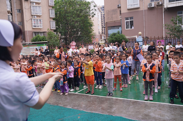 简短的致辞过后,来自医院护理部的护士小姐姐带来了一支歌伴舞《洗手歌》,她们用欢快童趣的形式,生动的向幼儿园的小朋友们演示了科学“七步洗手法”的方法,护士们还邀请小朋友上台一起,大家互动学习,能正确演示洗手步骤的小朋友,还获得了医院赠送的小礼品。