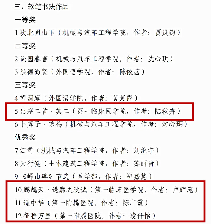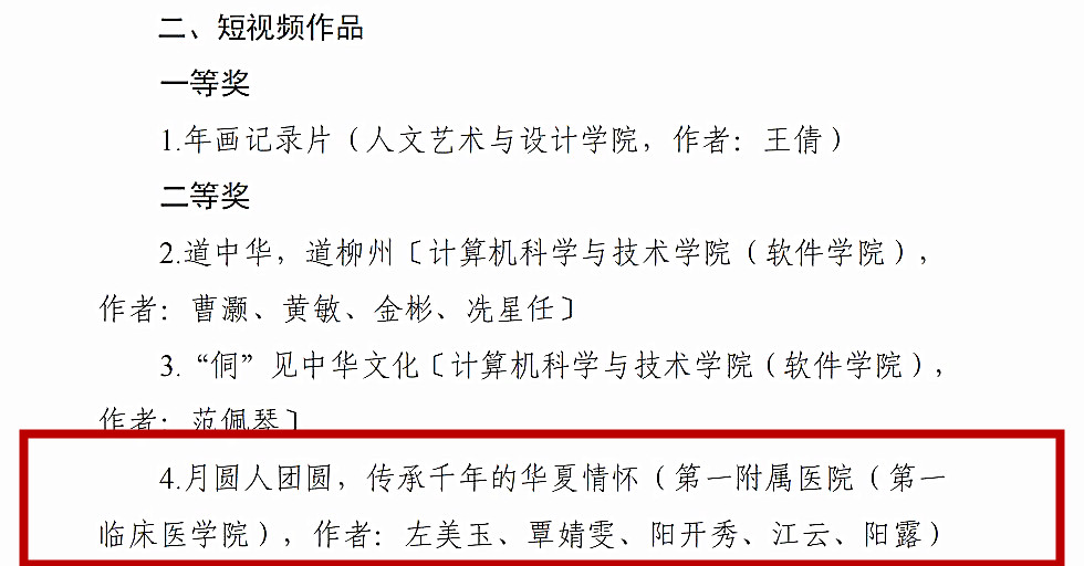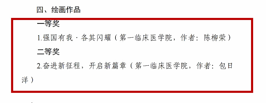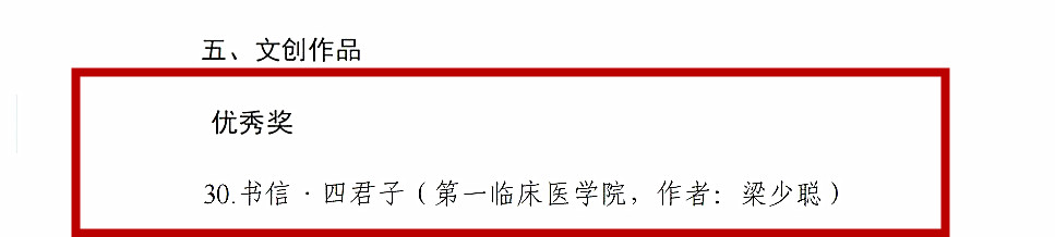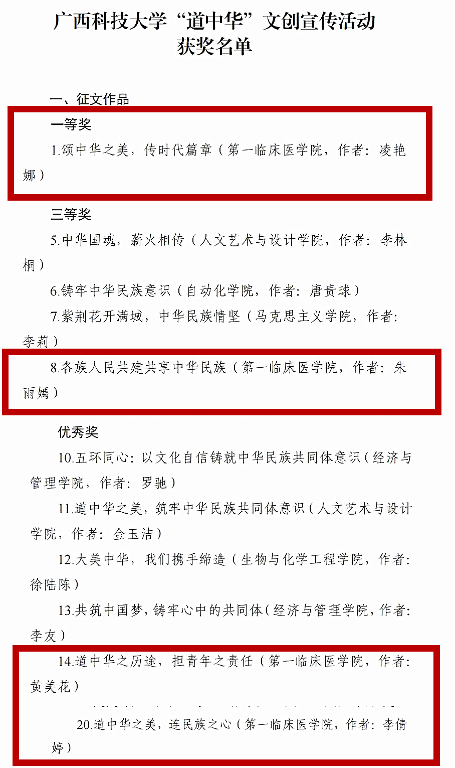 近日,广西科技大学委员会统战部公布了“道中华”文创宣传活动评比结果的通知,第一临床医学院荣获征文作品一等奖、三等奖各一个,优秀奖两个;短视频作品二等奖一个;软笔书法作品三等奖一个,优秀奖三个;绘画作品一等奖、二等奖各一个;文创作品优秀奖一个。