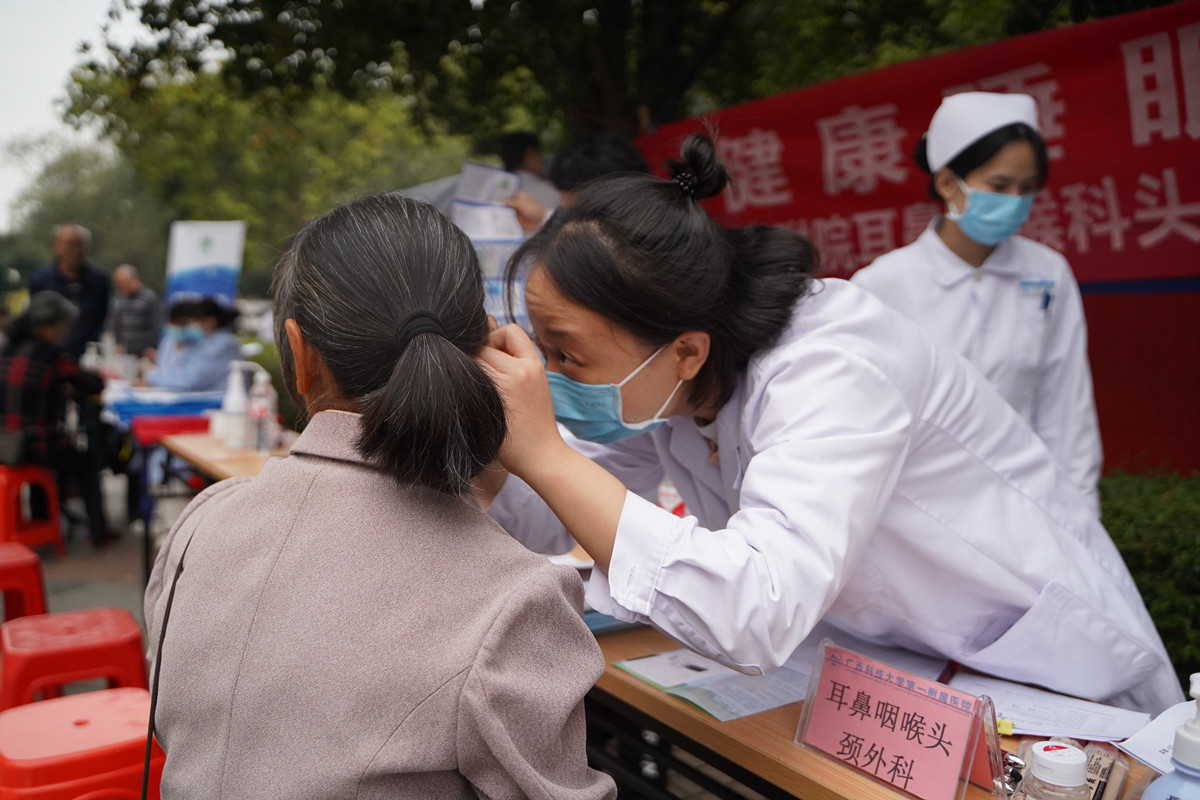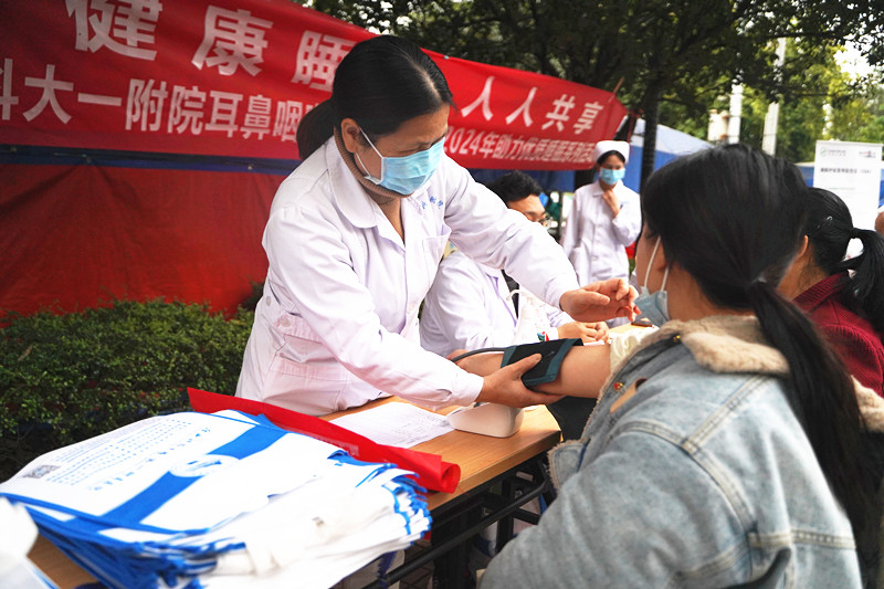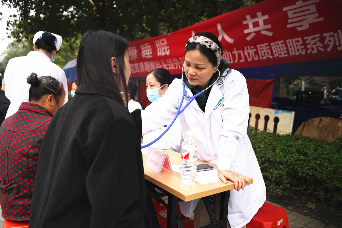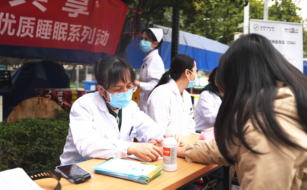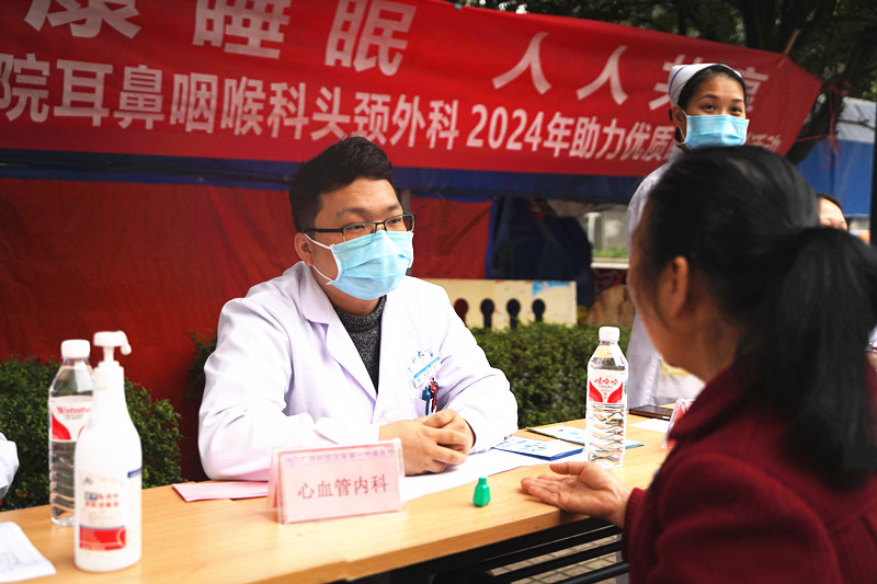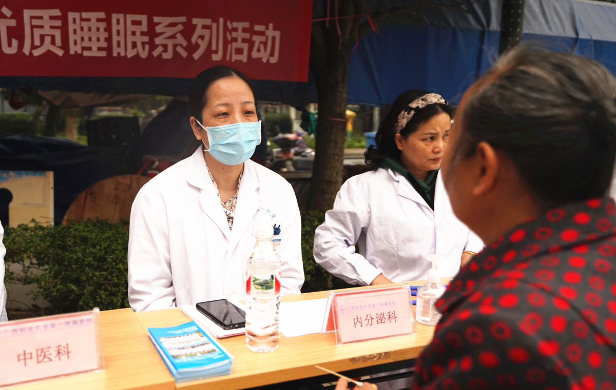 3月21日早上9点,广西科技大学第一附属医院(第一临床医学院)耳鼻咽喉头颈外科联合多学科在柳北区桂景湾水天一州步行街口开展主题为“健康睡眠 人人共享”世界睡眠日义诊。由呼吸内科主任医师梁新梅、内分泌科主任张琰、普外科二病区主任胡春格、耳鼻咽喉头颈外科负责人覃炯英、中医科副主任傅婷、耳鼻咽喉头颈外科医师宋佳若和心血管内科医师吴冠杰组成的专家团队,为前来咨询的群众提供健康咨询和进行睡眠有关的科普宣传。
