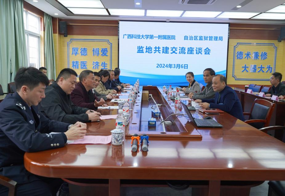 3月6日下午,自治区监狱管理局狱政管理处处长李春萌、宣传处处长孔莉等自治区监狱管理局领导一行8人,至广西科技大学第一附属医院(第一临床医学院)(下简称广西科大一附院)进行监地共建座谈交流会。院党委书记庞晓红、党委副书记、院长覃天等院领导出席会议,双方就监地共建取得成效及下一步工作计划进行交流座谈。会议由覃天主持。