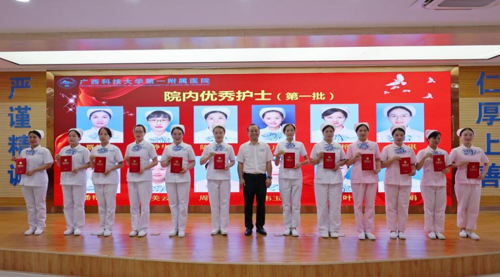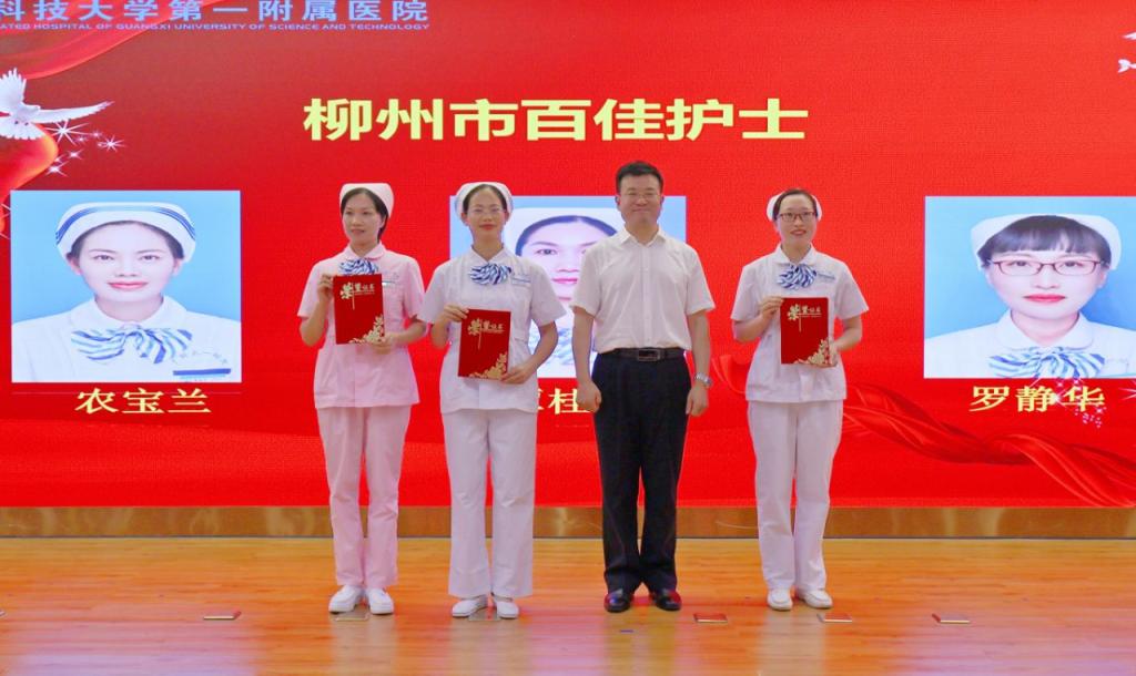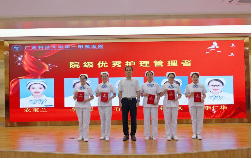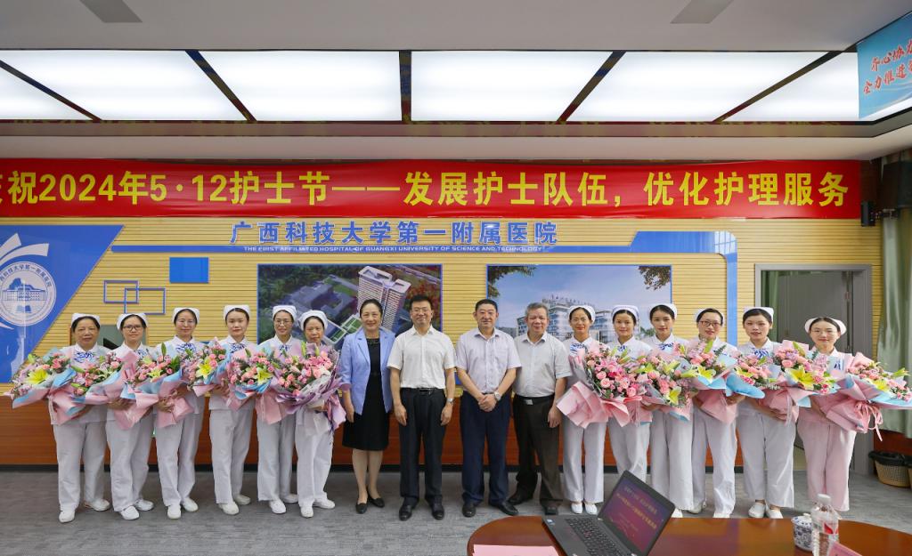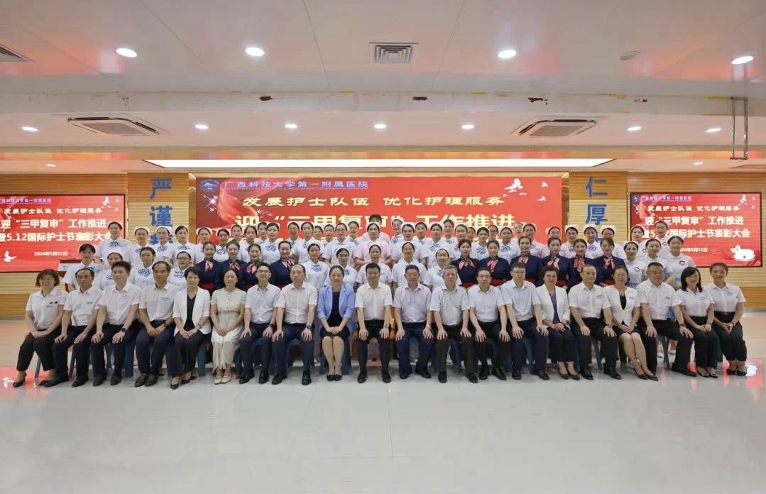5月11日上午,在第113个国际护士节来临之际,为顺利实现成功通过三级综合医院复审(下简称“三甲复审”)的任务目标及弘扬南丁格尔精神、表扬先进典型,广西科技大学第一附属医院(第一临床医学院)举行2024年庆祝“5·12”国际护士节座谈会,召开迎“三甲复审”推进会暨庆祝“5·12”国际护士节表彰大会。广西科技大学党委书记赵君,党委副书记、校长刘宝臣,党委常委、副校长秦小云,党委常委、副校长张发钦等学校领导出席各项会议及活动,学校领导慰问优秀护士代表,听取“三甲复审”工作汇报,为先进典型颁发荣誉。医院党委书记庞晓红,党委副书记、院长覃天等全体医院领导班子全程陪同。