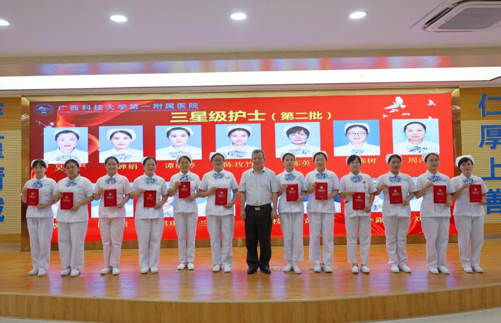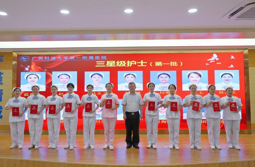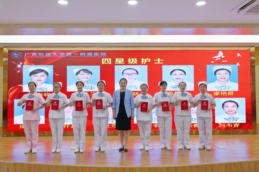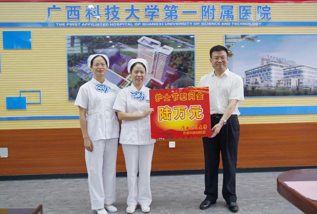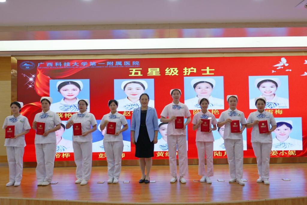 5月11日上午,在第113个国际护士节来临之际,为顺利实现成功通过三级综合医院复审(下简称“三甲复审”)的任务目标及弘扬南丁格尔精神、表扬先进典型,广西科技大学第一附属医院(第一临床医学院)举行2024年庆祝“5·12”国际护士节座谈会,召开迎“三甲复审”推进会暨庆祝“5·12”国际护士节表彰大会。广西科技大学党委书记赵君,党委副书记、校长刘宝臣,党委常委、副校长秦小云,党委常委、副校长张发钦等学校领导出席各项会议及活动,学校领导慰问优秀护士代表,听取“三甲复审”工作汇报,为先进典型颁发荣誉。医院党委书记庞晓红,党委副书记、院长覃天等全体医院领导班子全程陪同。