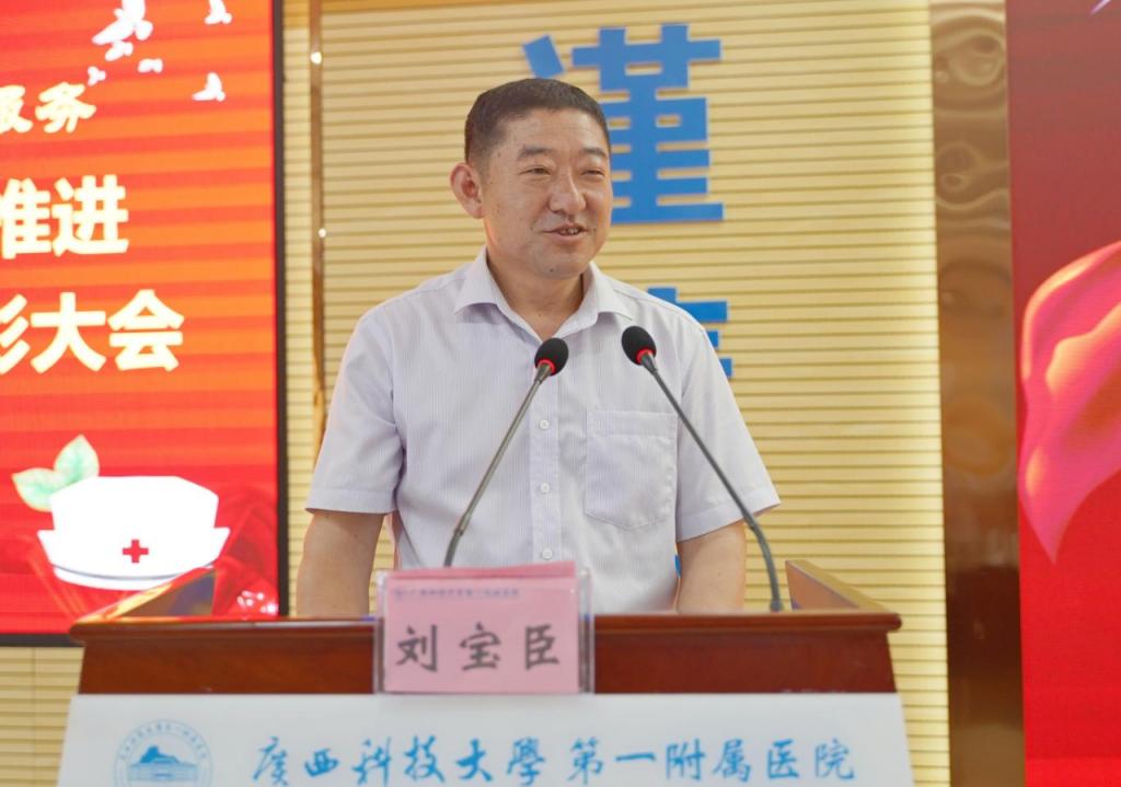 大会上,刘宝臣指出,近年来,在学校党委、行政的坚强领导下,附属医院紧跟学校发展步伐,迎难而上,锐意改革,全面提升医德、医技素质,狠抓医疗质量和服务水平,做了大量卓有成效的工作。为全方位满足人民群众多元化医护服务需求,推动学校医学教育和医院事业高质量发展,他强调,一附院要坚持和加强党的全面领导,优质高效完成医院“三甲复审”工作;要真诚关爱护士健康成长,营造良好的护理工作环境;要勇于担当实干,全力推动医院各项事业高质量发展。今年是新中国成立75周年,是学校医学教育和医院事业高质量发展的关键之年,他勉励大家践行“敢为人先、百折不挠,务实创新、追求卓越”的广西科大精神,坚定信心,众志成城,全力以赴,攻坚克难,当好守护人民群众和学校师生生命健康的忠诚卫士,用智慧和汗水推动医院高质量发展,为奋力谱写国内先进特色鲜明高水平应用型大学作出新的更大贡献。