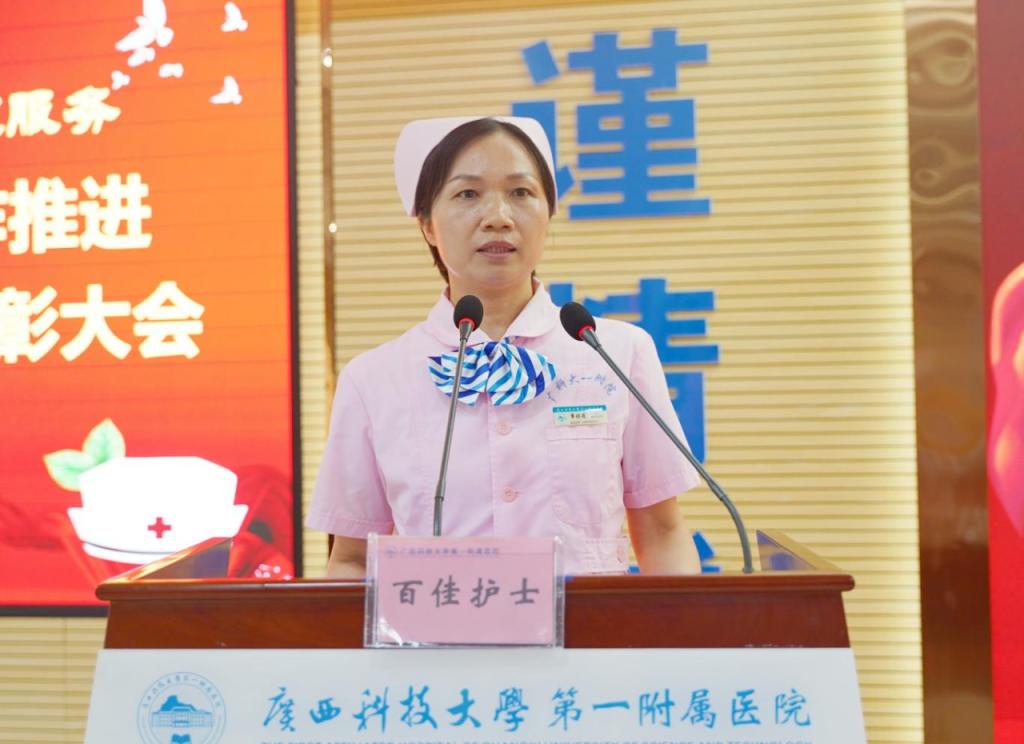 当天活动中,柳州市百佳护士获得者覃桂莲作为护士代表发言,她用自己在岗位上的收获和感悟,讲述了护理工作者用柔弱的肩膀,挑起了守护生命健康重担的故事,体现了护理职业用细心、耐心、爱心、责任心驱走病魔的神圣使命。