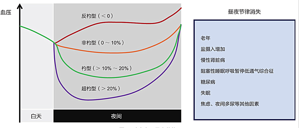 高血压患者的血压波动规律消失,呈非勺型曲线与心脑血管事件密切相关,如下图。