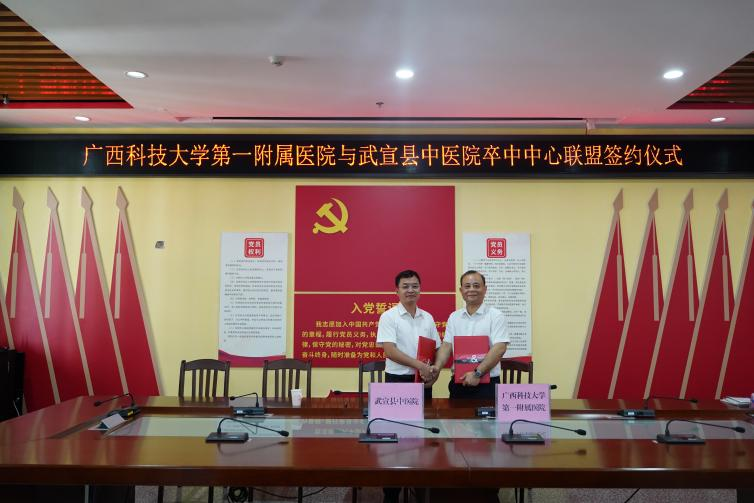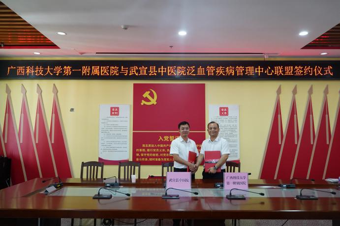 2024年5月21日,广西科技大学第一附属医院(第一临床医学院)(下简称广西科大一附院)与武宣县中医院签订泛血管疾病管理中心联盟、卒中中心联盟共建协议。广西科大一附院党委副书记、院长覃天,武宣县中医院党委副书记、院长李康等双方院领导出席签约仪式。