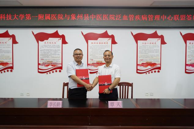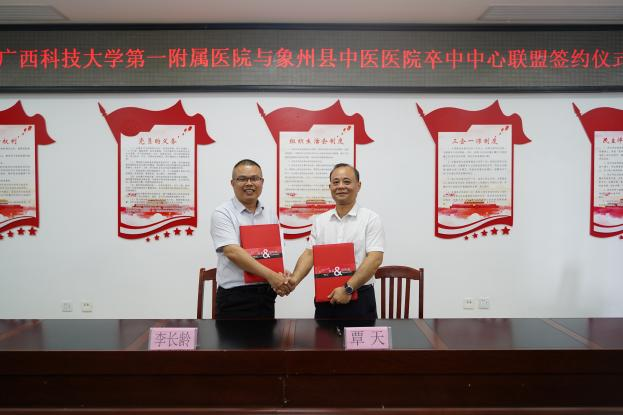 2024年5月21日,广西科技大学第一附属医院(第一临床医学院)(下简称广西科大一附院)与象州县中医医院签订泛血管疾病管理中心联盟、卒中中心联盟共建协议。广西科大一附院党委副书记、院长覃天,象州县中医医院党总支副书记、院长李长龄等双方院领导出席签约仪式。