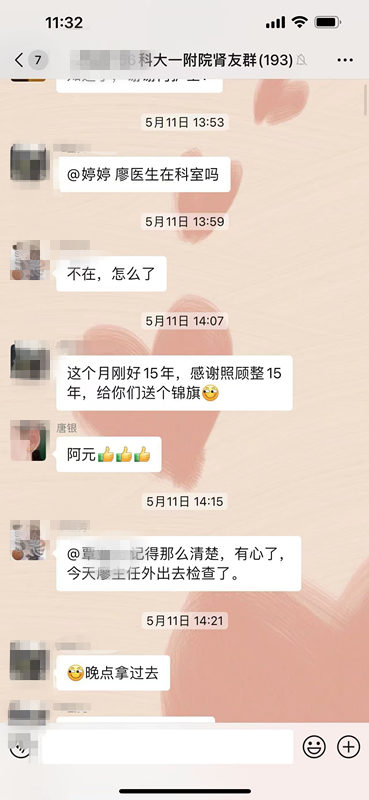 送锦旗的是一位33岁的血透患者,他在肾内科血液净化室进行血液透析已经第15个年头了。2009年3月,该患者才10岁就踏上了漫长而艰难的透析之路,大家都叫他为“元仔”,给他专业的治疗、细心的照顾。有时候错过了饭点,医护人员还给他送饭,或者分享自己家的做的美食,给予他最大的鼓励、疏导、安慰以及帮助。日复一日的透析,让他很快的融入了透析大家庭中,大家都开玩笑的说,比陪伴自己的家人时间都多。