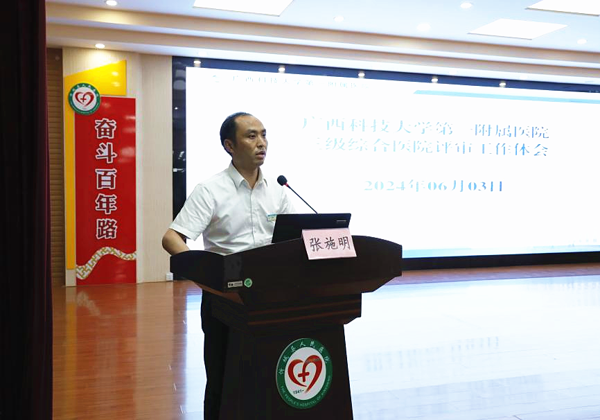 我院副院长张施明向忻城县人民医院全体职工分享医院等级评审筹备工作经验