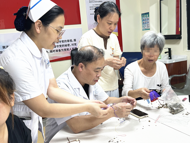 “我以前从来没有做过手工,今天跟着社工老师学习,觉得很有趣。”一位患者开心地说,“现在做完荷包,我准备把它送给家人,希望他们也感受到我的快乐。”