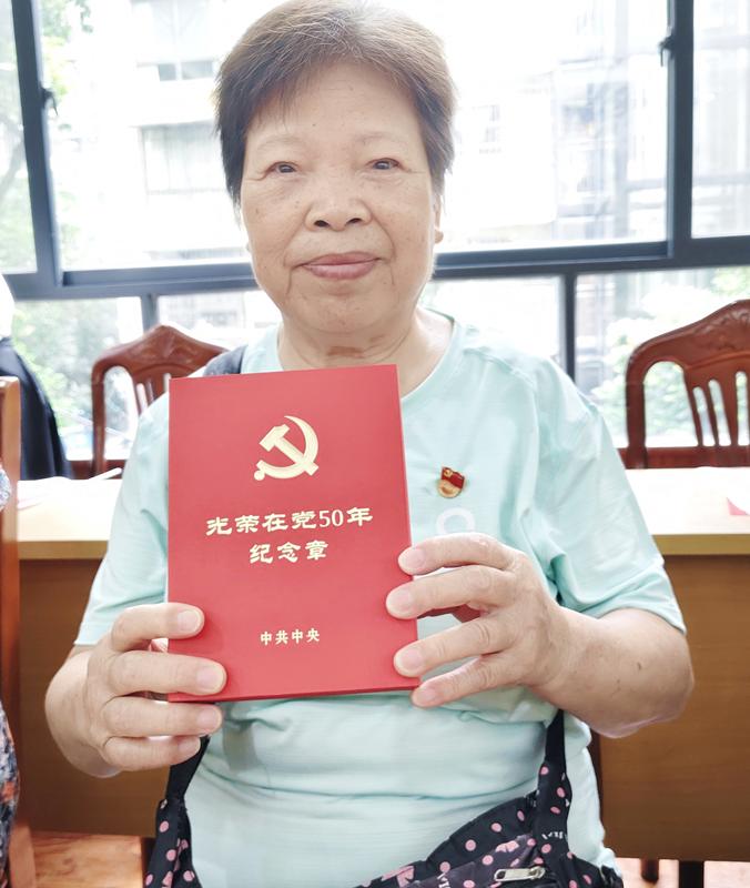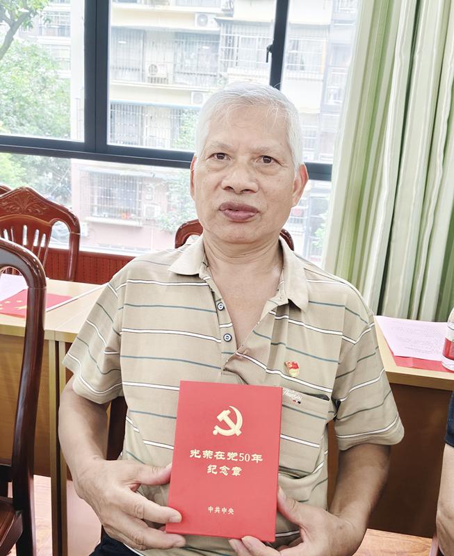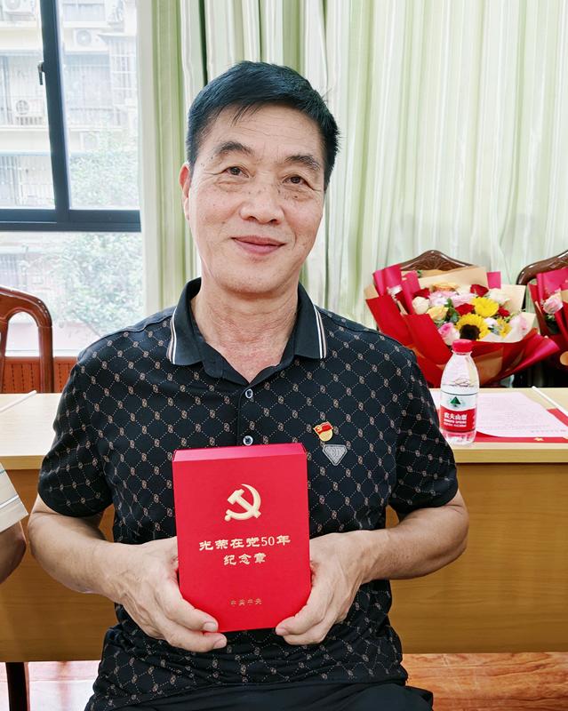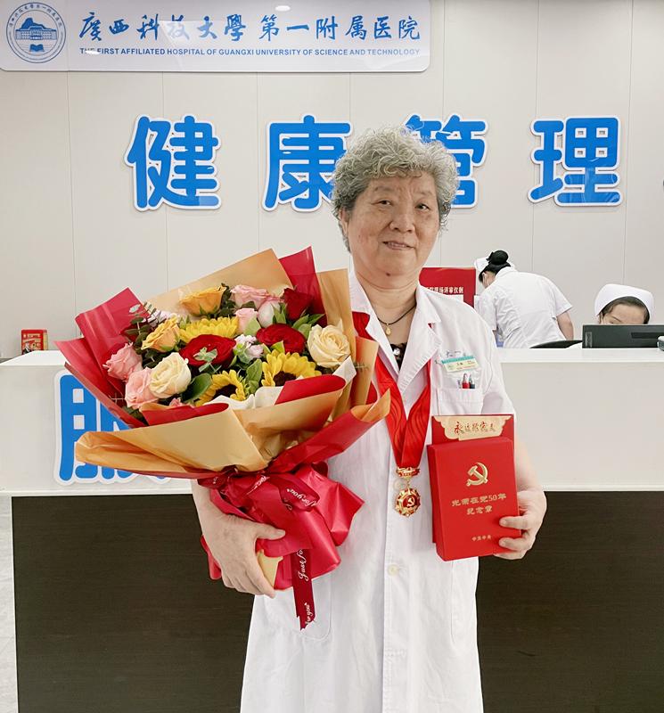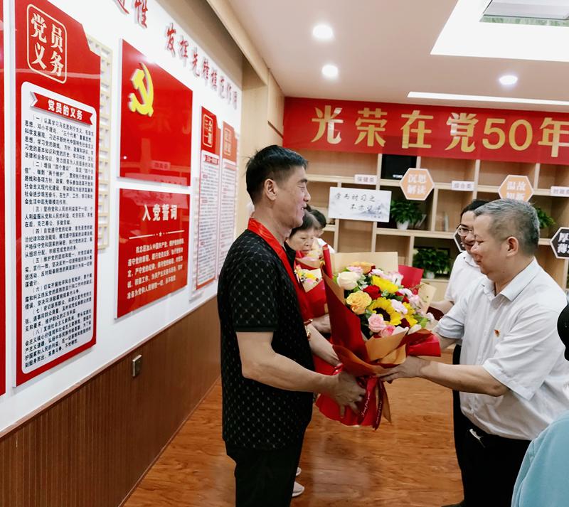我院7位有50年党龄的老党员分别是:王娅、卢小兰、周筱群、石春玉、韦荣思、周振英、黄玉基。纪念章承载着党的光辉历程,见证了老党员为党的事业辛勤付出和无私奉献,一束五彩的鲜花充分展现了上级领导对老党员们的亲切关怀。
