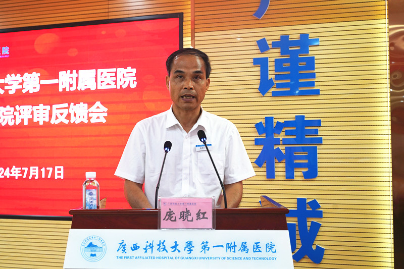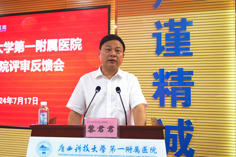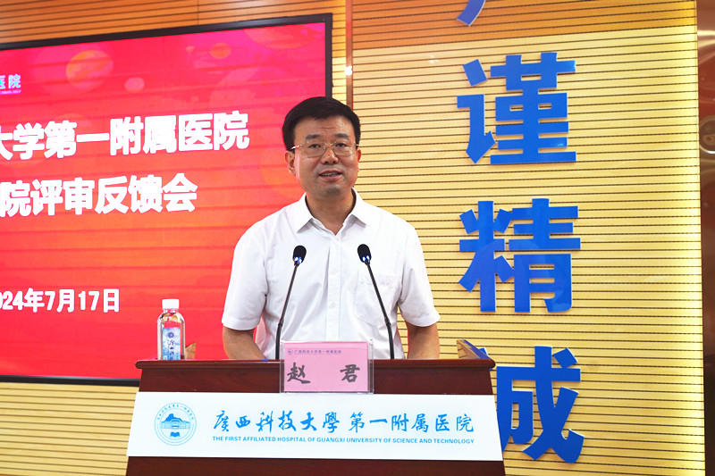 赵君代表广西科技大学党委、行政向自治区卫健委及等级医院评审专家组的细心指导表示衷心的感谢并致以崇高的敬意。他指出,等级医院评审工作,是学校、第一附属医院的大事、要事,此次评审中,各位专家对第一附属医院工作进行了全面的“大会诊”,也为第一附属医院事业高质量发展开出了“良方”。赵君表示,学校高度重视附属医院建设发展,对等级医院评审工作全力支持,他谈到了三点突出感受:一是敬佩之情。此次评审时间紧任务重,各位专家始终站在医院发展的角度考虑问题,维护医院正常运转、切实减轻医院负担,工作作风扎实、务实,令人印象深刻,真正体现了以人民为中心的发展理念,体现了医者仁心的高尚情怀;二是权威之高。各位专家理念先进、视野开阔、业务精湛,站在医院的行业标准,结合医院的工作实际,研究问题火眼金睛、入木三分,反馈意见中肯、客观,提出了专业化、高水平、高标准的意见,时刻体现出高度的专业化水平;三是落实之行。专家提出的意见是学校、第一附属医院发展的强大动力、宝贵财富。希望全体同志做好评审后半篇文章,保持清醒、正视短板,以滚石上山的意志走好整改的爬坡之路、攻坚之路,对照专家组提出的意见和建议及三甲医院建设标准,迅速科学制定整改方案,精准细化分解任务,全方位落实整改责任,真正体现“以评促改、以评促建”的要求,实现一附院高质量发展。