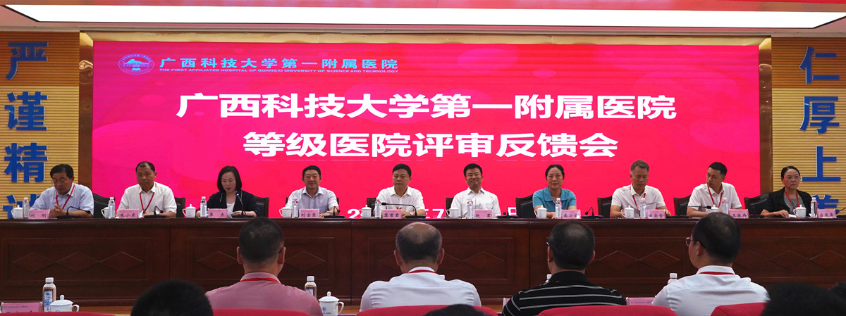 7月17日下午3:30,等级医院评审反馈会在医院学术报告厅召开。自治区卫生健康委副主任黎君君,广西科技大学党委书记赵君,党委副书记、校长刘宝臣,党委常委、副校长秦小云,自治区卫生健康委医政处副处长覃杰,自治区医管中心主任黄宗金,柳州市卫生健康委员会党组成员、副主任黄培昌等领导出席了会议。评审专家组各位专家,医院党政领导,各部门负责人、护士长及陪检员等参加会议。会议由覃杰主持。