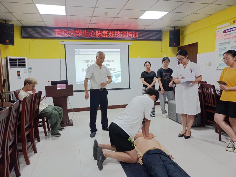 相关数据表明,当出现心脏骤停,一分钟内得到有效的心脏复苏,90%的患者可以救活。正值暑期,为增强在校生的公共安全意识,提高青年群体在紧急情况下自救互助能力,7月22日,我院应邀到医联体单位柳北区长塘镇卫生院开展在校生急救技能培训活动。