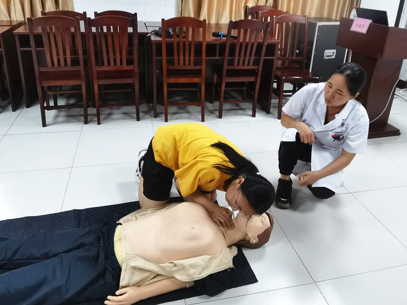 韦建革进行了急救知识理论授课,他详细分析具备高质量急救技能的必要性,传授了急救技能的基本要领。急诊科蒋阿妹医师及长塘卫生院急救团队,对同学们进行手把手急救技能操作培训。老师们认真教学、同学们热情参与,通过示范和教学,同学们基本掌握了心肺复苏技能操作并通过考核,确保了培训效果。
