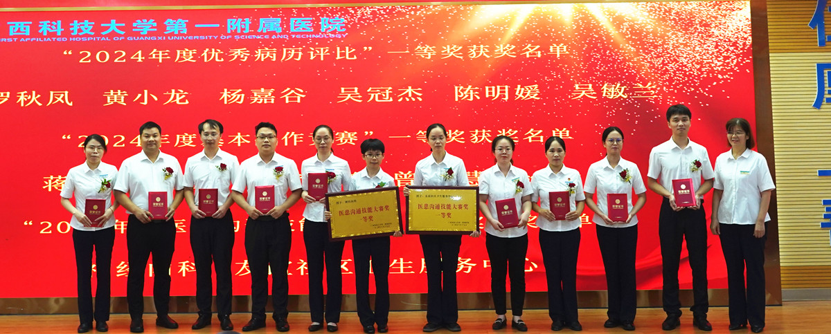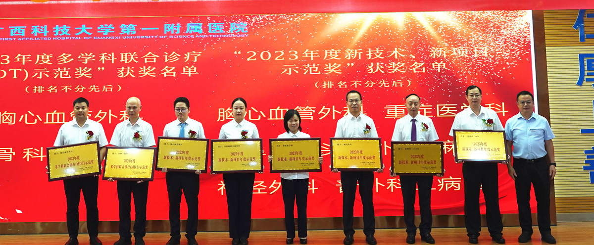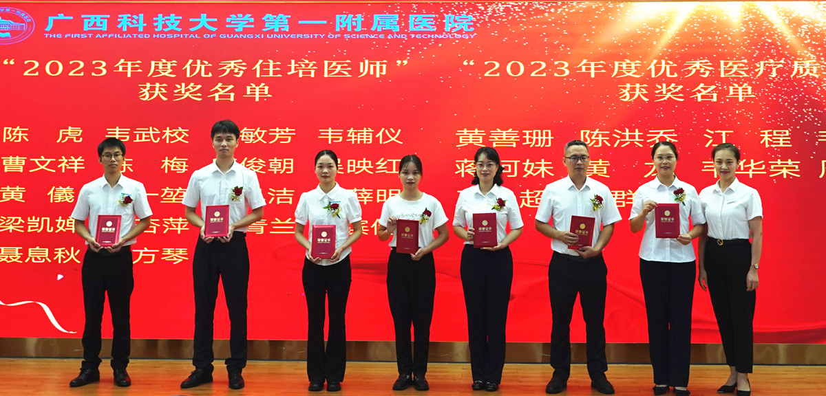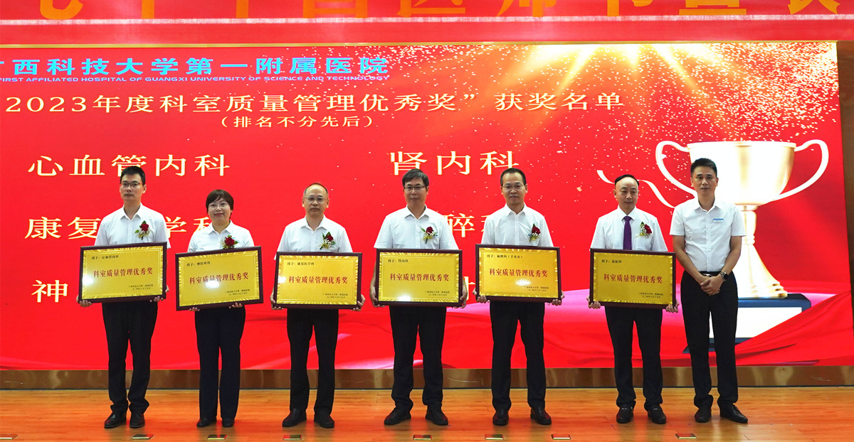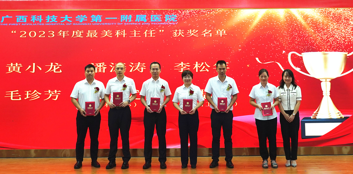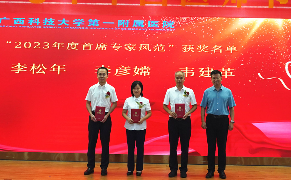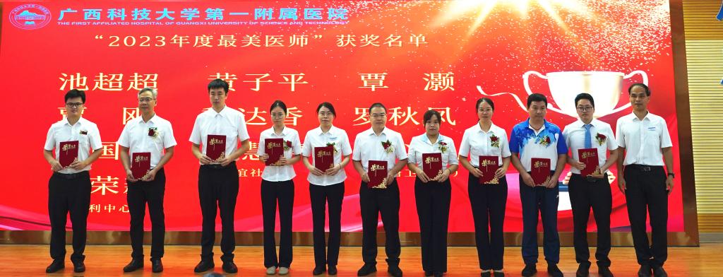 医院党委副书记何曲波宣读表彰名单,会议表彰了“2023年度科室质量管理优秀”“从医30年‘老骥伏枥’”“2023年度最美医师”“2023年度柳州市百佳医师”“首席专家风范”等15个奖项。