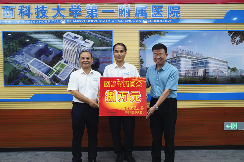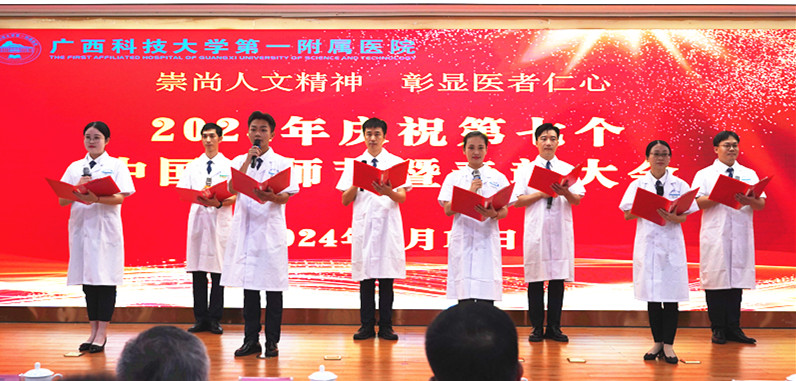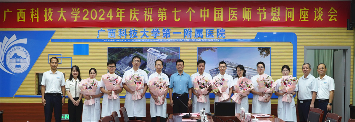 为庆祝第七个中国医师节,表彰先进,引导全体医务人员向优秀典型学习,坚持人民至上、生命至上。8月18日上午,广西科技大学党委书记赵君率队到我院看望慰问优秀医师代表,学校党委副书记张发钦,党委常委、副校长邓朗妮陪同慰问。当天,我院同时在学术报告举行了2024年庆祝第七个中国医师节暨表彰大会,学校领导出席表彰大会。我院党委书记庞晓红主持座谈会和表彰大会,党委副书记、院长覃天在表彰大会上致辞。