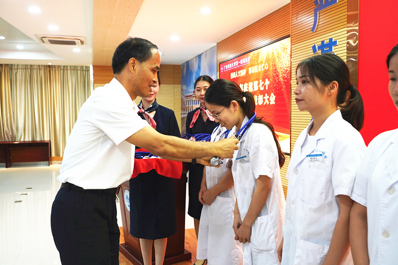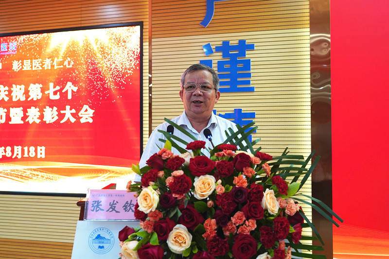 学校党委副书记张发钦在表彰大会上讲话。他指出,学校始终高度重视附属医院发展,坚持“强工兴医、精文育新”,积极探索“医工结合”新模式,持续推进“院院合一”,在医疗质量提升、医学人才培养、服务地方人民健康等方面持续发力,实现了医院高质量发展。他希望全体医师要做有梦想、有本事、有温度、有担当、有格局的医师,以受表彰的先进集体和个人为标杆,胸怀“两个大局”、心怀“国之大者”,以人民健康为中心,齐心协力、风雨同舟,为医院的新一轮发展、为建设“健康广西”、实现“十四五”奋进目标添砖加瓦,为建设国内先进特色鲜明高水平应用型大学贡献附属医院力量。