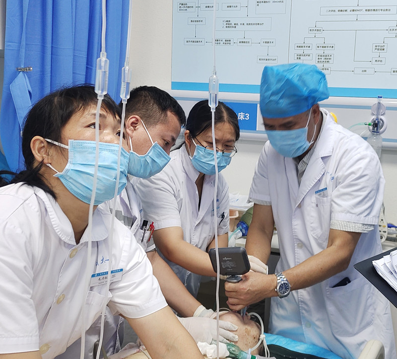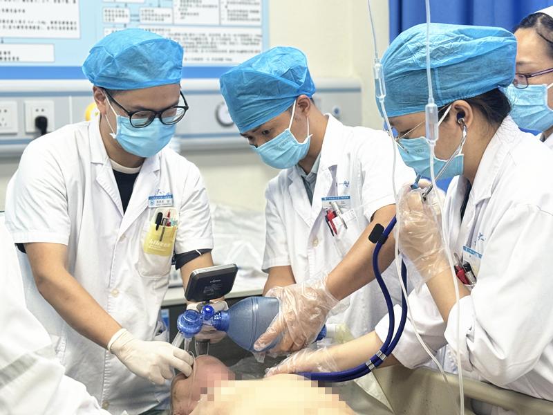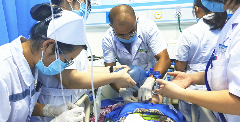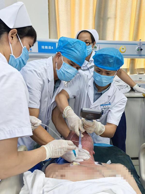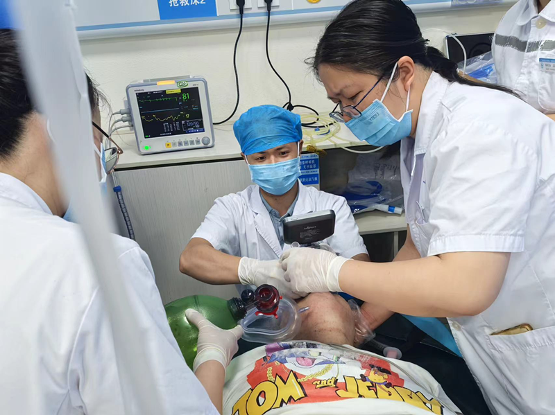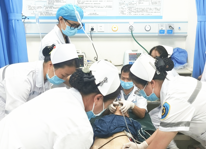 几分钟后转运到了院内,科室副主任陈新立即指挥大家一起开展了抢救。因为有了院前的预警,我们的抢救人员及抢救物品都已经准备就绪,我跟家属沟通病情签字,黄河炜医生、黄玮医生都放下手中的其它工作迅速投入到抢救中来。辅助通气、建立第二条静脉通路、抗休克、镇静、气管插管、吸痰、上呼吸机……所有抢救措施一气呵成,短短10多分钟就把病人从生命垂危的状态中抢救过来,接着又安全地把病人送住院部进一步救治。