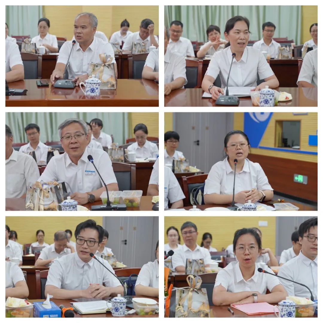 急诊科主任韦建革,临技中心主任陈晓敏,骨科一病区副主任覃刚、心血管内科王颖颖博士、科教科杨暘博士、学工办副主任许璐分别作为退休教师、教龄30年教师、教研室负责人、青年骨干教师、新入职教师、辅导员代表进行交流发言。