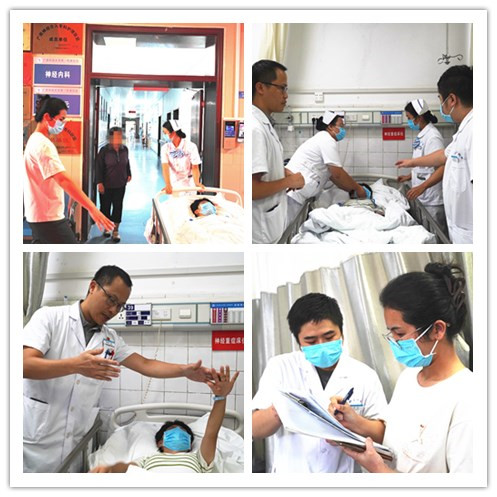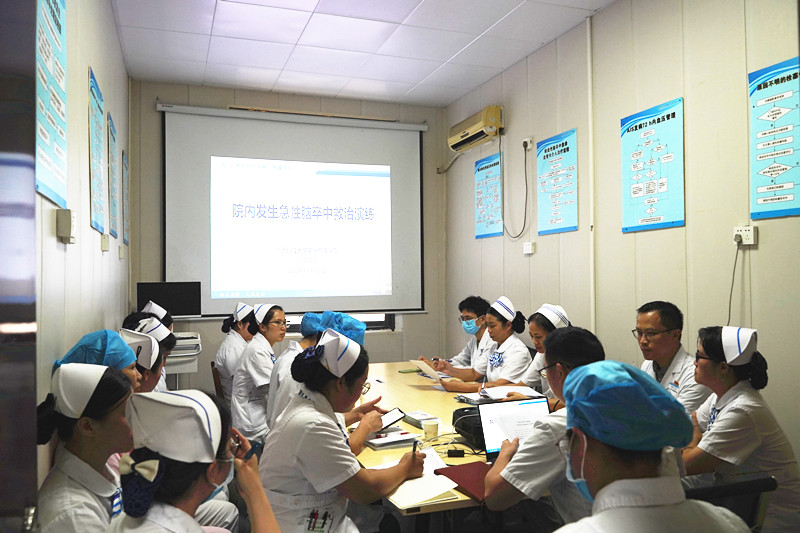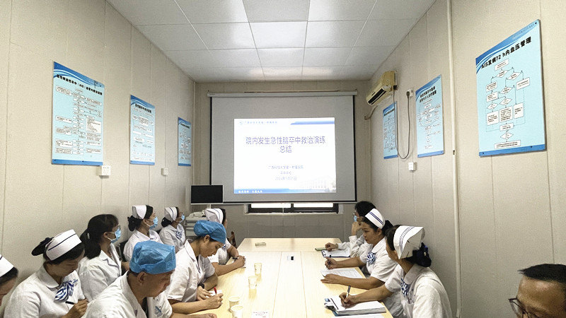 为保障医院脑卒中患者救治工作顺利开展,加强各相关科室协同救治能力建设,提高医疗质量,保障医疗安全,9月25日下午4点,广西科技大学第一附属医院开展院内发生急性脑卒中救治演练。演练总指挥为副院长黄进瑜,主持人为医务部副部长谢正德。医务部、护理部、神经内科、神经外科、医学检验科、CT室、导管室、麻醉科、重症医学科等相关科室参与演练,其他临床科室派医护人员观摩学习。