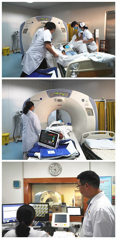 演练模拟眼科住院患者、73岁李萍在与家属交谈中突发言语困难、右侧肢体无力,呼叫医务人员。临床科室医生、护士快速到达床旁询问症状,神经系统检查明确体征,判断为急性脑卒中,立即电话通知神经内科、神经外科急会诊,启动急性脑卒中绿色通道。时间就是大脑,时间就是生命。医护人员快速给患者测量血糖、床旁心电图、抽血、送检标本,会诊后送CT室检查。演练模拟两种CT结果。